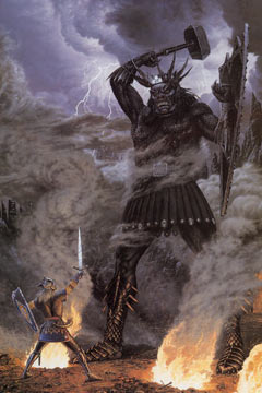 Тут вернулся Гейррод и, выхватив щипцами из огня раскаленный железный шар, запустил им в Тора, который руками, защищенными рукавицами Грид, поймал его и швырнул обратно все еще горячий дымящийся шар, который угодил великану в живот. Уходя, Тор прикончил всех слуг Гейррода.