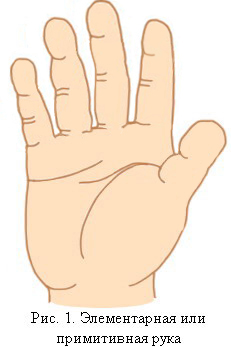 Внешние признаки: ширина Примитивной, или как ее еще называют, Элементарной руки почти равняется длине (длина измеряется от кистевого сгиба до конца пальцев). Рука грубая, а пальцы малоподвижны. Большой палец невелик и неуклюж, а из-за плохой подвижности обыкновенно немного отстает от ладони.