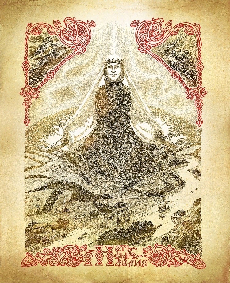 Мать Сыра Земля, в славянской мифологии важный персонаж с древнейших времен. Земля представлялась воображению язычника, обожествлявшего природу, живым человекоподобным существом. Травы, цветы, кустарники, деревья казались ему ее пышными волосами; каменные скалы признавал он за кости (заметно созвучие слов «скала» и «скелет»); цепкие корни деревьев заменяли жилы, кровью земли была сочившаяся из ее недр вода. И, как живая женщина, она рождала существ земных, она стонала от боли в бурю, она гневалась, учиняя землетрясения, она улыбалась под солнцем, даруя людям невиданные красоты, она засыпала студеною зимой и пробуждалась по весне, она умирала, обожженная засухой и возрождалась после дождей.