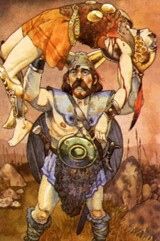 Золотое кольцо на пальце Конлайха, подаренное Кухулином его матери, слишком поздно открыло герою имя собственного сына. Кухулин обрел славу непобедимого воина, когда защищал Ольстер от королевы Медб. Лишившись поддержки богини смерти Морриган, после того как отверг ее любовь, Кухулин получил ужасную рану в живот, которую даже Луг, его отец, не мог залечить. Он умирал стоя, привязав себя к священному камню. И тотчас Морриган, богиня войны и смерти, в обличье вороны уселась на его плечо, а враги отрубили Кухулину голову и правую руку, оставив тело стервятникам. Потерю защитника оплакивал весь Ольстер.