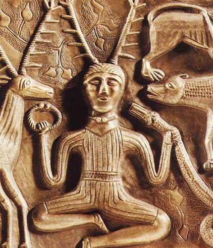 На знаменитом котле из Гундеструпа Цернунн, кельтский бог, сидящий в позе лотоса, показан в окружении диких животных — оленя, кабана и льва. В одной руке он держит торквес, ожерелье воина, в другой — змею, символ власти.