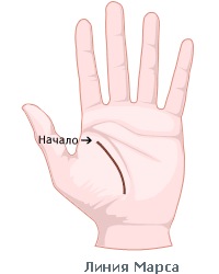 Эта линия иногда просматривается на холме Венеры. Она идет приблизительно параллельно линии жизни. Усиливает или изменяет предсказания, полученные при толковании линии жизни. Так, если линия жизни говорит о неблагоприятных явлениях или о чем-то сомнительном, то линия Марса может смягчить характер прогноза или же показать его в совершенно ином свете. В случае, когда линия жизни и холм Венеры совершенно четко говорят о чем-то, то линия Марса это подтверждает.