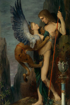 Вследствие этого Эдип, считавший Полиба своим отцом, покинул Сикион. На дороге он встретил Лая, затеял с ним ссору и в запальчивости убил его и его свиту. В это время в Фивах производило опустошения чудовище Сфинкс, задававшее несколько лет подряд каждому загадку и пожиравшее всех, кто ее не отгадывал. Эдипу удалось разгадать эту загадку (какое существо утром ходит на четырех ногах, в полдень на двух, а вечером на трех? Ответ — человек), вследствие чего Сфинкс бросился со скалы и погиб. В благодарность за избавление страны от продолжительного бедствия фиванские граждане сделали Эдипа своим царем и дали ему в жены вдову Лая, Иокасту — его собственную мать.