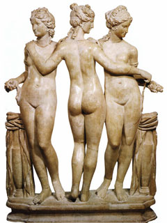 Хариты, в древнегреческой мифологии богини благодеяний. Хариты - дочери Зевса и океаниды Эвриномы, воплощали радостное, доброе и вечно молодое начало. Звали этих прекрасных богинь Аглая ("сияющая"), Евфросина ("благомыслящая") и Талия ("цветущая"). В различных мифах упоминаются всевозможные варианты как числа харит, так и их имен. Например, Гомер рассказывал о младшей харите Пасифее, которую Гера пообещала отдать замуж - за бога сна Морфея.