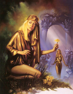 Персефона, в греческой мифологии дочь Зевса и богини Деметры. Богиня плодородия и земледелия Деметра очень любила свою единственную дочь, красавицу Персефону. Для нее она вырастила прекрасные душистые цветы на лугах Эллады, позволила стрекозам и бабочкам порхать среди них, а певчим птицам наполнять луга и рощи мелодичным пением. Юная Персефона обожала светлый мир дяди Гелиоса - бога Солнца и мамины зеленые луга, пышные деревья, яркие цветы и журчащие повсюду ручейки, на поверхности которых играли блики солнца. Ни она, ни ее мать не знали, что Зевс пообещал ее в жены своему мрачному брату Аиду - богу подземного царства.