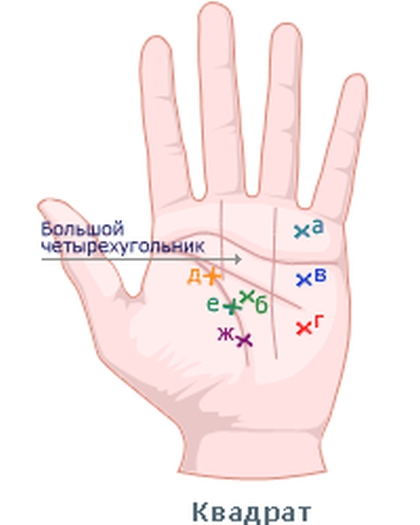 Пересечения Линий Головы и Сердца Линиями Судьбы и Солнца образуют более или менее правильный квадрат. Некоторые под этим термином понимают более широкую область между линией здоровья, пересекающей линии головы и сердца, и холмом Марса над Венерой, ограниченную линиями головы и сердца. Чем больше эта область похожа на прямоугольник, тем лучше.