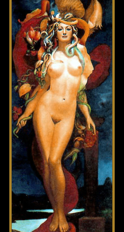 "Ибо до Евы была Лилит", - гласит древнееврейский текст. Легенда о ней вдохновила английского поэта Данте Габриэля Россетти (1828-1882) на поэму "Eden Bower". Лилит была змея, она была первой женой Адама и подарила ему "glittering sons and radiant daughters" ("сверкающих сыновей и сияющих дочерей"). Еву Бог создал потом; чтобы отомстить земной жене Адама, демоница Лилит уговорила ее отведать запретный плод и зачать Каина, брата и убийцу Авеля. Такова первоначальная форма мифа, которой следовал Россетти.