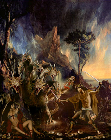 Сусаноо вызвался помочь, если старики отдадут ему в жены младшую дочь. Он приготовил рисовую водку (сакэ), разлил ее в восемь бочек, и дракон, выпив хмельной напиток, заснул. Сусаноо разрубил Ямата-но Ороти на куски и в одном из них обнаружил волшебный меч Кусанаги. Этот меч Сусаноо преподнес богине солнца Аматэрасу, а та пожаловала его своим потомкам как символ их власти над Японией. Культ бога бури Сусаноо, как победителя дракона Ямата-но Ороти, был особенно распространен в земле Идзумо (современная префектура Симанэ).