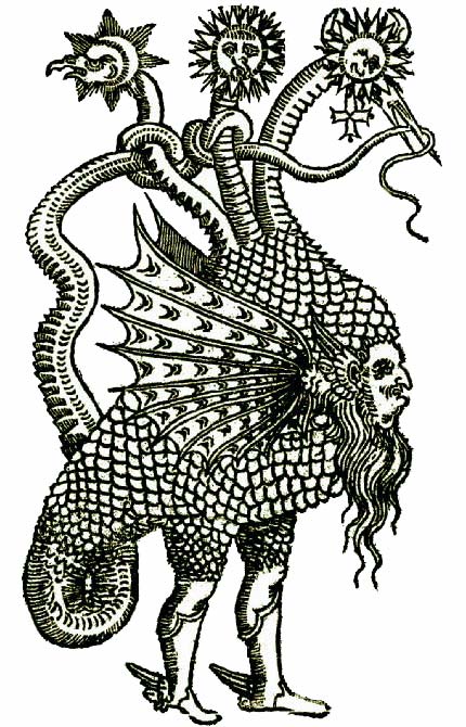 Тифон — (греч. Τυφών) — могущественное чудовище, пороженное Геей; олицетворение огненных сил земли и её испарений, с их разрушительными действиями. По одной версии мифа, Тифон был рожден Геей и Тартаром, по другой - его породила богиня Гера, ударив рукой по земле. Она сделала это в отместку Зевсу, который сам породил Афину. Тифона воспитывал Пифон - огромным змей, рожденный богиней земли Геей. Тифон представлен в легендах как существо с сотней драконьих голов, туловищем, подобным человеческому, покрытым оперением, вместо ног у чудовища были змеиные кольца. В некоторых источниках сообщается, что головы Тифона подобны человеческим, но он может воспроизводить крики животных.