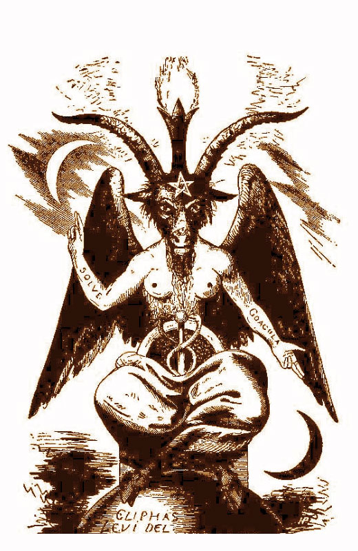 Изображение дьявола, основанное на фигуре Бафомета («козла шабаша») Элифаса Леви, насыщено символикой. У Сатаны голова, нижняя часть и раздвоенные копыта козла и крылья инфернального ангела. В центре живота расположен кадуцей, а в качестве третьего глаза - шестиконечная звезда (обычно изображаемая как пентаграмма). Над головой возвышается тройная корона из огня, а рука указывает на символ луны. Одновременное наличие рогов и женской груди олицетворяет соединение во зле мужской и женской силы.