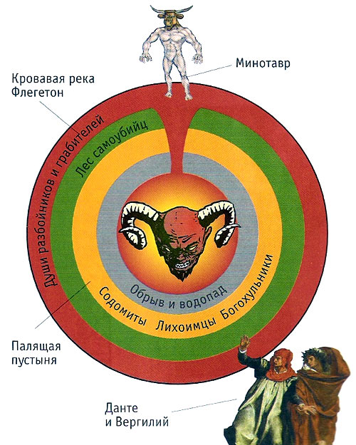 На окраине седьмого круга ада, охраняемого Минотавром, расположен обвал, за которым течет кипящая кровавая река Флегетон, где погребены тираны, разбойники и грабители. Второй пояс этого круга — дикий лес, где в деревья превращены самоубийцы. На них сидят гарпии. Третий пояс — раскаленная пустыня, где томятся половые извращенцы, лихоимцы и богохульники. Замыкает седьмой круг ада обвал, в который низвергается Флегетон.