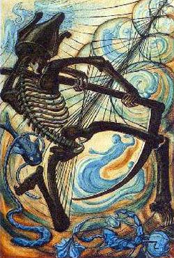 Образ Смерти в виде скелета с косой означает освобождение от тела. Коса или серп - атрибуты Смерти являются также атрибутами времени - римского Сатурна и индийского бога времени Махакалы. Серп - символ Луны и ассоциируемыми с ней идеями приливов и отливов, нарастания и убывания жизненных циклов. Внизу изображены человеческие черепа - знак круговорота явлений и превращений в природе и в нас.