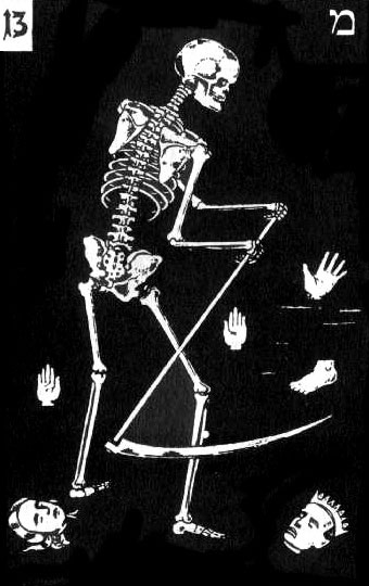 Смерть, аркан Таро (13 - сотворение и уничтожение, сила и господство, конец негативной ситуации, глубокие внутренние изменения, возрождение). Воспринимается как цикл в цепи существования. Это не последняя карта, а вместе с картой Повешенного означает переход ко второй колоде карт. В отдельных колодах не пишут название этой карты, показывая, что смерти не существует, а есть переход к новым формам существования. Отказ от «эго», символизируемом картой Повешенный позволяет войти в мир духовных форм.