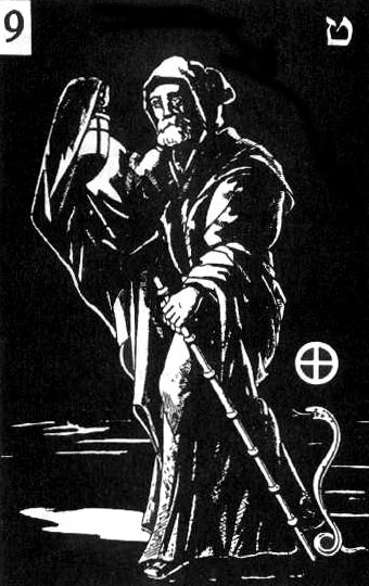 Отшельник, аркан Таро (9 - Мудрец - мудрость, добродетель). Искатель и хранитель мудрости, мудрец с посохом - символом духовного странствия. Плащ на плечах - готовность к пути. У него в руках фонарь, означающий высшее знание, по-новому высвечивающее все окружающее. Преклонный возраст - свидетельство зрелости внутреннего опыта, и отстраненности от заблуждений и иллюзий.