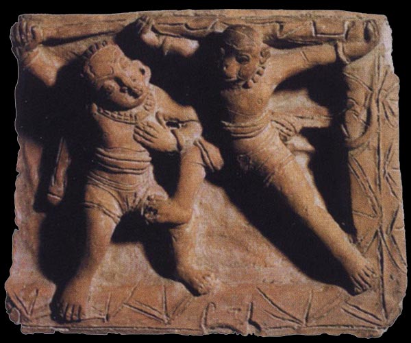 Бог Хануман, побеждающий демона. Терракота, V век.