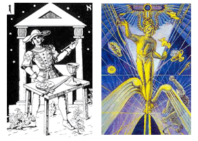 Маг, аркан Таро (1 - Адам Кадмон человечества). Инициатор процесса трансформации. Одет в головной убор, образующий знак бесконечности - символ господства и вечной жизни, свидетельство гармонического взаимодействия сил, мыслей и чувств, желаний и эмоций. Одна рука его с магическим жестом - поднята вверх, чтобы достичь вечности. Другой рукой он указывает на стол с набором предметов, среди них пентакль (знак существования), чаша (знак любви), жезл (знак мудрости) и меч (знак внутренней реализации).