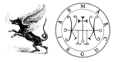 Тридцать пятый Дух зовется Мархосиас (Marchosias). Он Великий и Могущественный Маркиз, появляется в образе волка [в другом варианте - быка - прим. перев.] с крыльями грифона и хвостом змеи, изрыгая из пасти огонь. Но через некоторое время, по команде заклинателя, он принимает человеческую форму, [очень сильный борец, дает правдивые ответы на все вопросы и помогает заклинателю в делах - в редакции Кроули-Мазерса эти слова отсутствуют]. Он принадлежит к Чину Господств. Он властвует над 30 Легионами Духов. Он сказал своему Повелителю, а это был Соломон, что спустя 1200 лет, он надеется вернуться к Седьмому Престолу. И вот его Печать, сделай ее и носи как Ламен