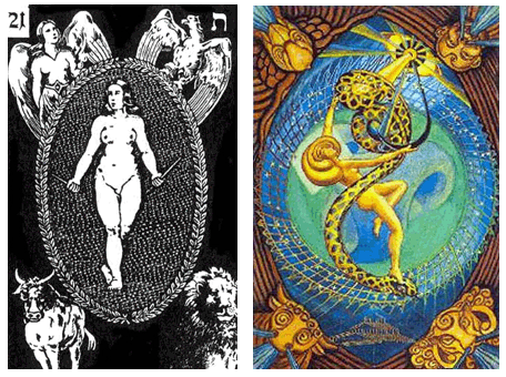 Мир, аркан Таро (21 - Вселенная, Время - номер завершенности). Эта цифра приравнивается к нулю, карте Глупец - по отказу от предзаданных концепций в пользу непосредственного опыта. Овал - символ полноты творения, в виде лаврового венка вокруг обнаженной, покрытой легкой вуалью золотоволосой женщины с магическим жезлом в левой руке. Вуаль говорит о бесконечности постижения тайн существования.
