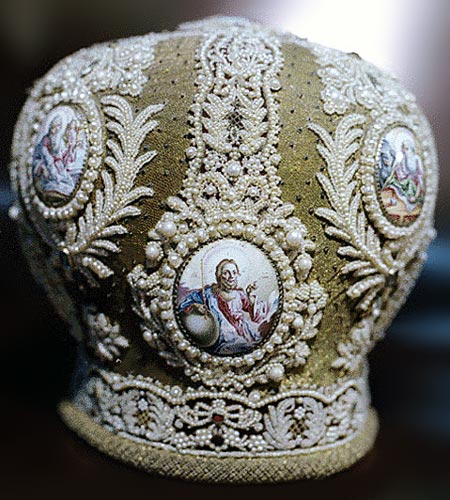 Епископская митра в традициях православной церкви имеет богатую отделку и включает стилизованный трилистник, символизирующий Троицу.