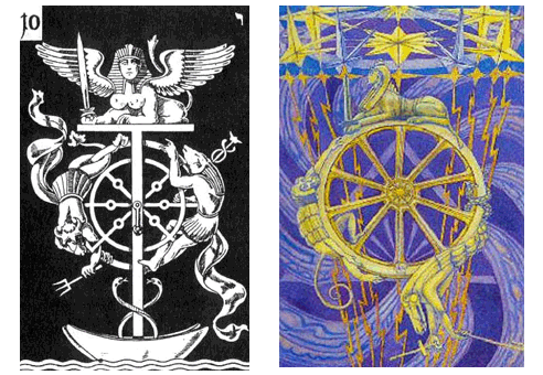 Десятая карта Таро Колесо Фортуны несет в себе идею наращения опыта, позволяющего выйти из круговорота чередующихся взлетов и падений судьбы. Дает разгадку сфинкса как посвященного, обуздавшего силу звериных страстей, которого поддерживают над миром явлений крылья орла. Означает вечное движение универсума и человеческой жизни.