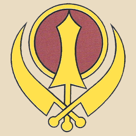 Эмблема сикхизма, известная как кханда, обычно изображается черным цветом на треугольном желтом Нишан Сахибе, флаге уважения. Эмблема состоит из кханды — обоюдоострого меча, который олицетворяет представление сикхов о святом воине, — окруженной чаккаром, стальным метательным кольцом (символ единства бога и человека). По обеим сторонам два кирпана, символизирующие духовную и мирскую власть.
