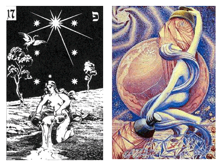 На обеих изображена женщина с двумя кувшинами. На этой карте она часто изображается обнаженной и без крыльев. Встав на колено, она выливает воду из кувшинов на землю, а не переливает из одного кувшина в другой, как на карте 14. Одной ногой она опирается на землю, другой стоит в воде. Женщина изображается на фоне идиллического пейзажа - под символами космической энергии, а также алхимии и астрологии.