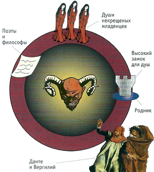 Душа Вергилия провела Данте в Лимб — первый круг ада. Он не является адом в прямом понимании этого слова, поскольку здесь содержатся античные праведники, нехристианские мудрецы и ученые, а также души младенцев, которых не успели окрестить. Они не несут наказания, но лишены доступа в paй. Некрещеные души обитают в окруженном родником замке, который обнесен семью стенами.