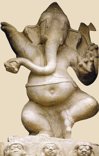 В индуистском пантеоне Ганеша, божество с головой слона, сын Шивы и Парвати, является богом мудрости, удачи, благоразумия и непобедимости, так как он способен устранять все препятствия. У него только один бивень - другой был отломан в битве. Голова принадлежит слону Айравате, ездовому животному - вахане - Индры (обозначает мудрость). Согласно индуистски мифам, завистливый бог Шани испепелил взглядом голову новорожденного младенца, и тогда Брахма посоветовал супруге бога Шивы Парвати срочно заменить безжизненную голову ребенка головой первого существа, которое встретится; таким существом оказался слон. Ганеша изображается с четырьмя руками (в одной он держит топор Шивы), которым и защищает и одаряет человечество.