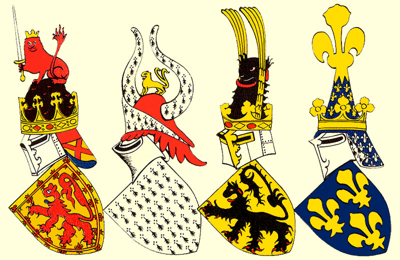 На странице из гербовника 1380 слева направо изображены гербовые щиты, шлемы и нашлемники короля Шотландии, герцога Бретонского, графа Фландрского и короля Франции. Как геральдические атрибуты (короны, щиты, шлемы, мантии, драпировки, подставки, цепи), так и их составные части (цвет, материал, металлы, меха, части, деление по рангам, цифры), помимо буквального или конкретного смысла, имеют символическое значение.