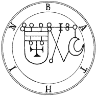 Восемндцатый Дух зовется Базин (Bathin), Он Могущественный и Сильный Герцог и появляется в образе сильного человека с хвостом змеи, верхом на лошади палевого цвета. Он открывает свойства трав и драгоценных камней и может внезапно переносить людей из одной страны в другую. Он правит более чем 30 Легионами Духов. Это его Печать, она должна носиться так же, как упомянуто выше.