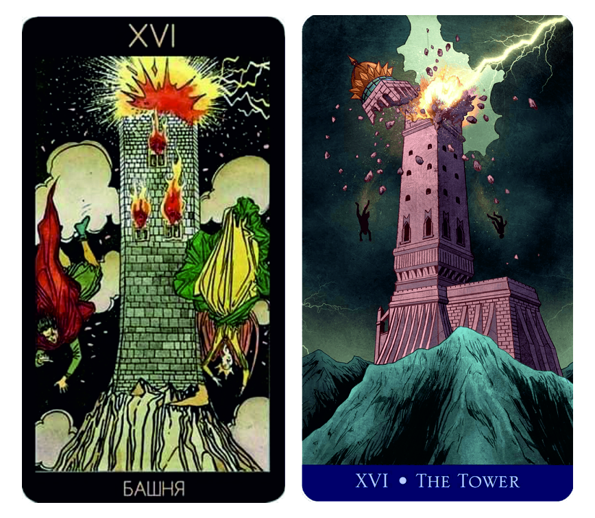 Башня, аркан Таро (16 - Разрушение - слабость, внезапное падение). Если человек попался в сети, расставленные дьяволом, он обречен на падение. Разрушительный удар направлен от Солнца и разрушает башню амбиций, построенную на ложных основаниях. В первую очередь поверженной падает верхушка башни, увенчанная короной с четырьмя зубцами - знак материализма. В ослепительной вспышке истины падают с башни мужчина и женщина.