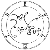 И если Белет все же не войдет в треугольник, произнеси вслух Обязательства и Заклинания перед ним, и тогда он согласиться повиноваться и войдет в него, и тогда Заклинатель сможет командовать им. К тому же Заклинатель должен быть с ним любезен, потому что Белет - Великий Король, ему надо оказывать почтение как это делают Короли и Принцы, которые ему прислуживают. И на среднем пальце твоей левой руки должно быть надето Серебряное Кольцо, и держи его перед лицом своим (чтобы уберечься от огненного дыхания свирепого Духа; образец этого кольца дается в конце инструкций для Магического Круга, и т.д., в Гоетии - прим. перев.). Также следует поступать при встрече с Амаимоном (Amaymon). Этот Великий Король Белет (Beleth) может вызвать любовь во всех ее проявлениях, и для Мужчин и для Женщин, если Мастер Заклинатель хочет удовлетворить свое желание. Он принадлежит к Чину Властей и управляет 85 Легионами Духов. Здесь его Величественная Печать, которую надо носить на своей груди во время делания.