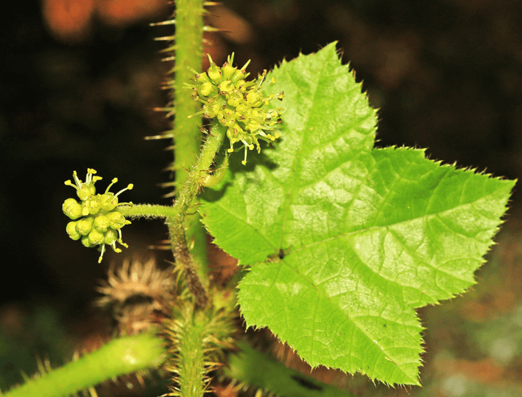 Ботаническое описание. Эхинопанакс высокий Echinopanax elatum — кустарник высотой 70-120 см, колючий, с длинным и толстым корневищем. Стебли светло-серые, с игольчатыми ломкими колючками. Листья очередные, длинночерешковые, крупные, округлые, с сердцевидным основанием, снизу светлые. Цветки мелкие, невзрачные, с 5 зеленоватыми лепестками, собраны в продолговатую кисть. Плод - оранжевая мясистая костянка. Цветет в июне - июле. Растет в местах с высокой влажностью воздуха, в еловых лесах, иногда на высокогорных каменистых осыпях на Дальнем Востоке, в южной части Приморского края.