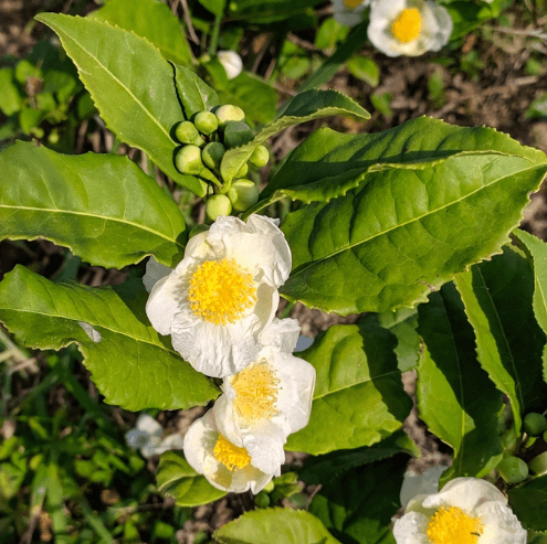 За счет подрезки растения чая обильно ветвятся. Листья глянцевые, темно-зеленые, удлиненно-яйцевидные; края их отчетливо пильчатые. Цветки одиночные, с 5-6 беловатыми лепестками и многочисленными желтыми пыльниками, имеют сильный запах и достигают 3 см в диаметре. Плод - коробочка, растрескивающаяся тремя створками, с тремя крупными шаровидными семенами. Цветет в августе - сентябре, плоды созревают в октябре - декабре. Лекарственным сырьем являются листья и ветви, собираемые при механизированной уборке плантаций. Чайный отсев (пыль, крошки) и побеги также служат сырьем для получения кофеина, теофиллина и других лечебных препаратов.