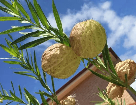 Ботаническое описание. Харг Gomphocarpus fruticosus - полукустарник высотой 40-150 см. Стебли многочисленные, с одревесневающими основаниями, прямостоячие, маловетвистые, мягкоопушенные, густооблиствленные. Листья супротивные, ланцетные, острые, длиной 7-10 см, короткочерешковые, голые или слабоопушенные. Цветки белые, на коротких цветоножках, собраны по 4-7 в зонтики, имеющие длинные цветоносы. Плод - продолговато-яйцевидная двулистовка. Цветет в июне - июле. Семена созревают в сентябре - октябре.