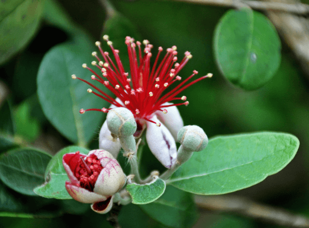 Ботаническое описание. Фейхоа Селлова Feijoa sellowiana - вечнозеленый кустарник высотой 2-5 м, с серо-желтыми ветвями. Листья супротивные, овальные, жесткие, блестящие, снизу серебристо-серые, опушенные, с характерным запахом. Цветки крупные, обоеполые, с четырехлистной чашечкой и четырехлепестным венчиком. Лепестки венчика беловатые, внутри темно-розовые, яйцевидные. Плод - ягода, продолговатая, желтоватая, многосемянная, размером с лимон. Мякоть плодов бело-кремовая, плотная, сочная, слегка кисловатая, с приятным вкусом. Семена мелкие, овальные. Цветет в июне - июле.