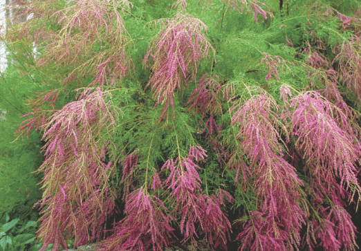 Ботаническое описание. Тамарикс многоветвистый Tamarix ramosissima - кустарник высотой 2-3 м, с мелкими сидячими зелеными или сизыми чешуевидными листьями, выделяющими на поверхность соль. Цветки мелкие, с чашечкой и розовым венчиком из 4-5 лепестков, собраны в длинные кисти. Плод - раскрывающаяся коробочка. Семена мелкие, с хохолком. Цветет в мае - августе.