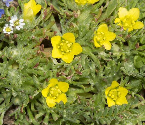 Ботаническое описание. Рогоглавник серповидный Ceratocephalus falcatus Rexs. - однолетнее травянистое растение высотой 3-10 см. Листья в виде розетки, пальчатотрехраздельные, с узколинейными цельными или лопастными долями. Цветки мелкие, бледно-желтые. Чашелистиков и лепестков венчика по 5, лепестки венчика с медовой ямкой. Тычинок и пестиков много. Плод -сборная семянка, очень колючая. Цветет в апреле - мае.
