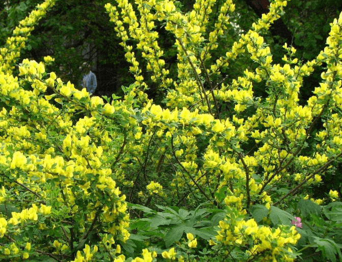 Ботаническое описание. Ракитник русский Cytisus ruthenicus - кустарник высотой до 2 м, с прутьевидными, малооблиствленными, опушенными побегами. Листья сложные, тройчатые, во время цветения слаборазвитые. Цветки мотыльковые, желтые, с крупным флагом. Чашечка трубчатая, двугубая, опушенная, с 10 сросшимися в тычиночную трубку тычинками. Пестик с шиловидным столбиком. Цветки сидят по 3-5 в пазухах листьев. Плод - опушенный боб. Цветет в мае - июле.