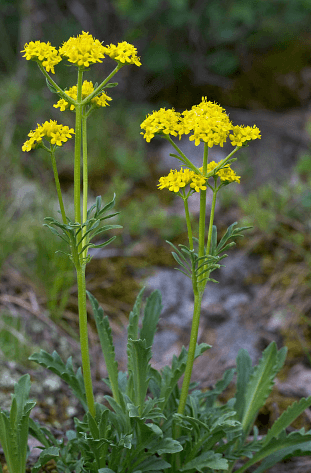 Ботаническое описание. Патриния сибирская Patrinia sibirica — многолетнее травянистое растение высотой 5-20 см, с толстым, длинным, многоглавым корнем и несколькими прямостоячими стеблями. Листья перистые или надрезанные, прикорневые листья иногда цельные. Ярко-желтые цветки собраны на концах стеблей в плотные щитковидные соцветия. Плод перепончатый, с разросшимся прицветником. Цветет в июне - июле. Растет по щебенистым и каменистым склонам гор в Кузнецком Алатау, на Алтае и в Саянах.