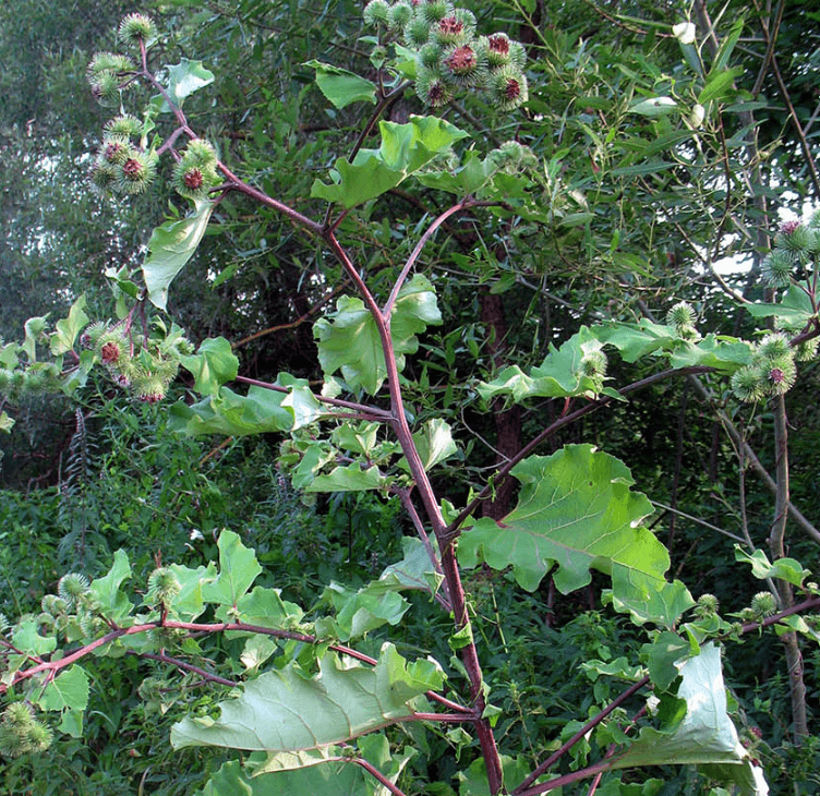 Ботаническое описание. Это двулетнее растение достигает в высоту 1-1,5 м и имеет мясистый до 60 см в длину корень, от которого отходят мелкие разветвления. Мощный продольно-бороздчатый стебель с большой сердцевиной обильно ветвится; нередко приобретает красную окраску в отдельных местах. На шерстисто-опушенных стеблях сидят черешковые сердцевидно-яйцевидные листья, сверху зеленые, а снизу серые, войлочно-опушенные; размер листьев заметно уменьшается снизу вверх. Синевато-красные довольно крупные соцветия располагаются в виде рыхлой зонтиковидной кисти. Желтоватые листочки обертки на конце крючковидные. Цветет в июне-июле. Лопух часто можно встретить по обочинам дорог, у заборов, стен и насыпей, на пустырях и выгонах, а также по берегам ручьев. Распространен почти по всей территории СНГ. Растет на плодородных почвах, часто у жилья, по обочинам дорог, на лесных опушках и полянах.