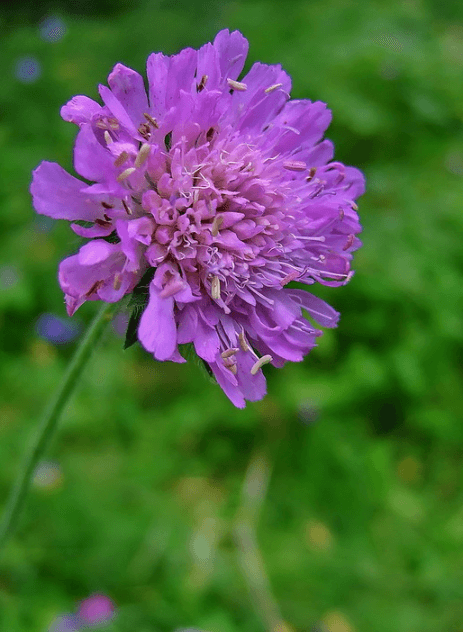 Ботаническое описание. Короставник полевой Knautia arvensis L. - многолетнее жестковолосистое растение высотой 20-70 см, с прямостоячим, вверху ветвистым стеблем, с розеткой прикорневых продолговато-ланцетных листьев. Стеблевые листья перисто раздельные, с ланцетными долями, из которых верхняя доля крупнее других. Цветки мелкие, светло-лиловые, неправильные, собраны в приплюснутые шаровидные головки, окруженные листочками травянистой обертки. Цветет в июне - августе. Растет по кустарникам, лугам, лесным полянам в степной и лесостепной зонах России.