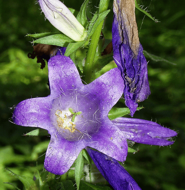 Ботаническое описание. Колокольчик крапиволистный Campanula trachelium L. - многолетнее травянистое растение высотой до 1 м, жестковолосистое, с остроугловатым стеблем и листьями, похожими на листья крапивы. Нижние и средние листья крупно-неравнопильчатые, длинно-черешковые, сердцевидные; верхние - сидячие, овально-ланцетные. Цветки крупные, колокольчатые, сине-лиловые, расположены по 1-3 в пазухах листьев. Плод - повислая коробочка. Цветет в июне - июле.