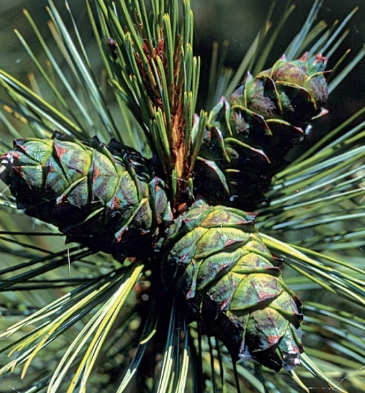 Ботаническое описание. Кедровый стланик Pinus pumila Regel. - кустарник или дерево высотой до 6-7 м, с лежащим на земле извилистым стволом и изогнутыми приподнимающимися ветвями. Хвоинки длиной 4-6 см, трехгранные, собраны по 5 в пучки. Шишки длиной 4-5 см, бочковидные, сначала красно-фиолетового цвета, потом зеленые, затем светло-бурые. Семена без летучек длиной 5-6 мм.