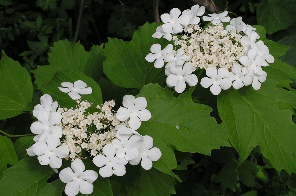 с характерным запахом. Кора светлая, на самых старых стволах мелкошелушащаяся, на молодых ветвях гладкая. Листья, за исключением самых верхних, трехлопастные с острыми лопастями и неправильно крупногородчато-зубчатыми краями 5-12 см длины, и 3-11 см ширины на черешках длиной до 4 см, совершенно голые или опушенные. Цветки двоякого рода: краевые крупные до 2 см в поперечнике, плоские, бесплодные, ярко-белые, остальные мелкие, чашеобразные, плодущие. Плоды светло-красные, сочные, горьковатые. Цветет во второй половине июля, плоды созревают в конце сентября. Распространена в Приморье и Хабаровском крае, Амурская область, Сахалин, Курильские острова (Шикотан, Кунашир, Итуруп), в Забайкалье. Общее распространение: Китай, Япония, п-ов Корея.