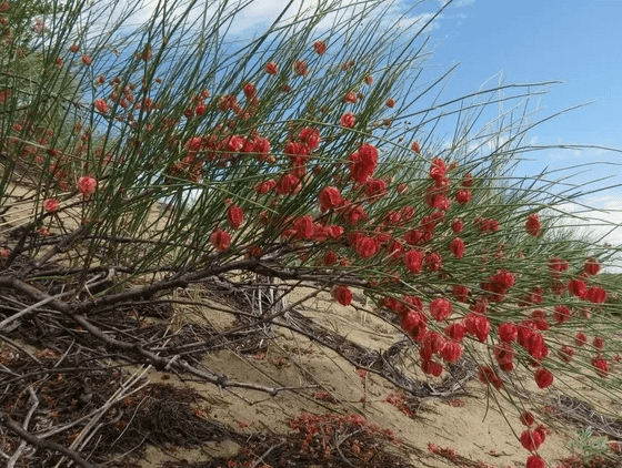 Ботаническое описание. Джузгун Calligonum L. — род многолетних ветвистых кустарников семейства Гречишные. Одна из ярких особенностей джузгунов — крылатые или покрытые многочисленными щетинками плоды, которые легко переносятся ветром, избегая при этом погребения песком. Латинское название рода происходит от греческих слов «callos» (красиво) и «gonos» (колено) и отражает своеобразный облик веточек растения, которые коленчато соединены друг с другом. Русское название «джузгун» — это видоизмененное казахское «жузгун», что означает: плоды растения, как солнце. Местное население называет это растение кандым, торлок, торлик, турлук или кислец. Последнее название связано с тем, что веточки джузгуна кислые на вкус и напоминают этим щавель, который также относится к семейству гречишных.