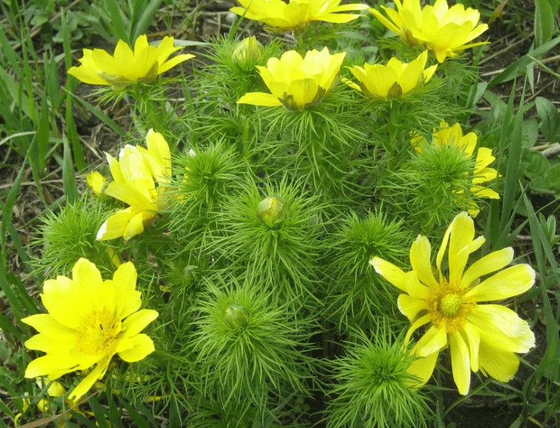 Ботаническое описание. Это изумительное растение стало столь редким, что встречается совсем в немногих местах. Поэтому оно находится под строгой охраной! Горицвет весенний - многолетнее растение 15-30 см в высоту; в земле закрепляется мощным корневищем, от которого отходят многочисленные корни. От корневища отрастает обычно несколько прямостоячих округлых стеблей, которые поначалу слабо опушены. На стеблях располагаются многочисленные трижды- или четыреждыперистые листья с нитевидными, острыми сегментами. Прямостоячий или поникающий цветонос заканчивается одним крупным золотистым и блестящим цветком (до 7 см в диаметре). Цветет с апреля по май. Горицвет весенний предпочитает степи с высоким травостоем. Встречается в Восточной и Южной Европе на солнечных возвышениях, сухих открытых местах или среди скал.