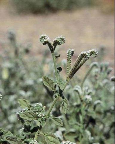 Ботаническое описание. Гелиотроп европейский Heliotropium europaeum — однолетнее травянистое растение высотой 20-30 см, опушенное, с очередными продолговато-эллиптическими листьями. Цветки беловатые, душистые, мелкие, собраны в густые верхушечные завитки. Чашечка пятираздельная, венчик трубчато-колосовидный. Тычинок пять. Пестик с верхней четырехгнездной завязью. Плод - 4 орешка. Цветет в июне - августе. Растение ядовито! Растет по сухим песчаным и каменистым склонам в южной полосе европейской части России, на Кавказе и в Средней Азии.