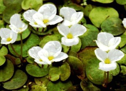 Ботаническое описание. Водокрас обыкновенный Hydrocharis morsus ranae - водное растение высотой 15-30 см, плавающее, с мочковатыми придаточными корнями. Листья с длинными черешками, небольшие, округлые, с глубокой сердцевидной вырезкой при основании. Цветки белые, однополые, тычиночные и пестичные. Цветет в июне - июле. Растет в озерах, прудах, речках с тихим течением, на болотах и в канавах в большинстве областей России.