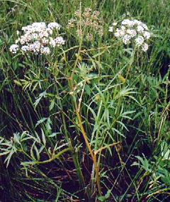 Ботаническое описание: Вех ядовитый - многолетнее травянистое растение. Корневище ранней весной совершенно плотное и почти округлое, осенью продолговатое, внутри полое и разделенное поперечными перегородками на отдельные камеры. Весной это растение растет быстрее других и на общем фоне выделяется своей величиной, привлекая внимание животных. Оно имеет толстое белое корневище и мелкие, тонкие корни, поэтому слабо укреплено в почве и легко вырывается полностью. Стебель внутри полый, тонко-бороздчатый, до 130 см высоты, сверху ветвистый. Листья на длинных черешках, двояко-, а ниже троякоперистые. Зонтики с 10-20 гладкими лучами; обертки нет или она состоит из 1-2 листочков; оберточки - из 8-12 линейных листочков.